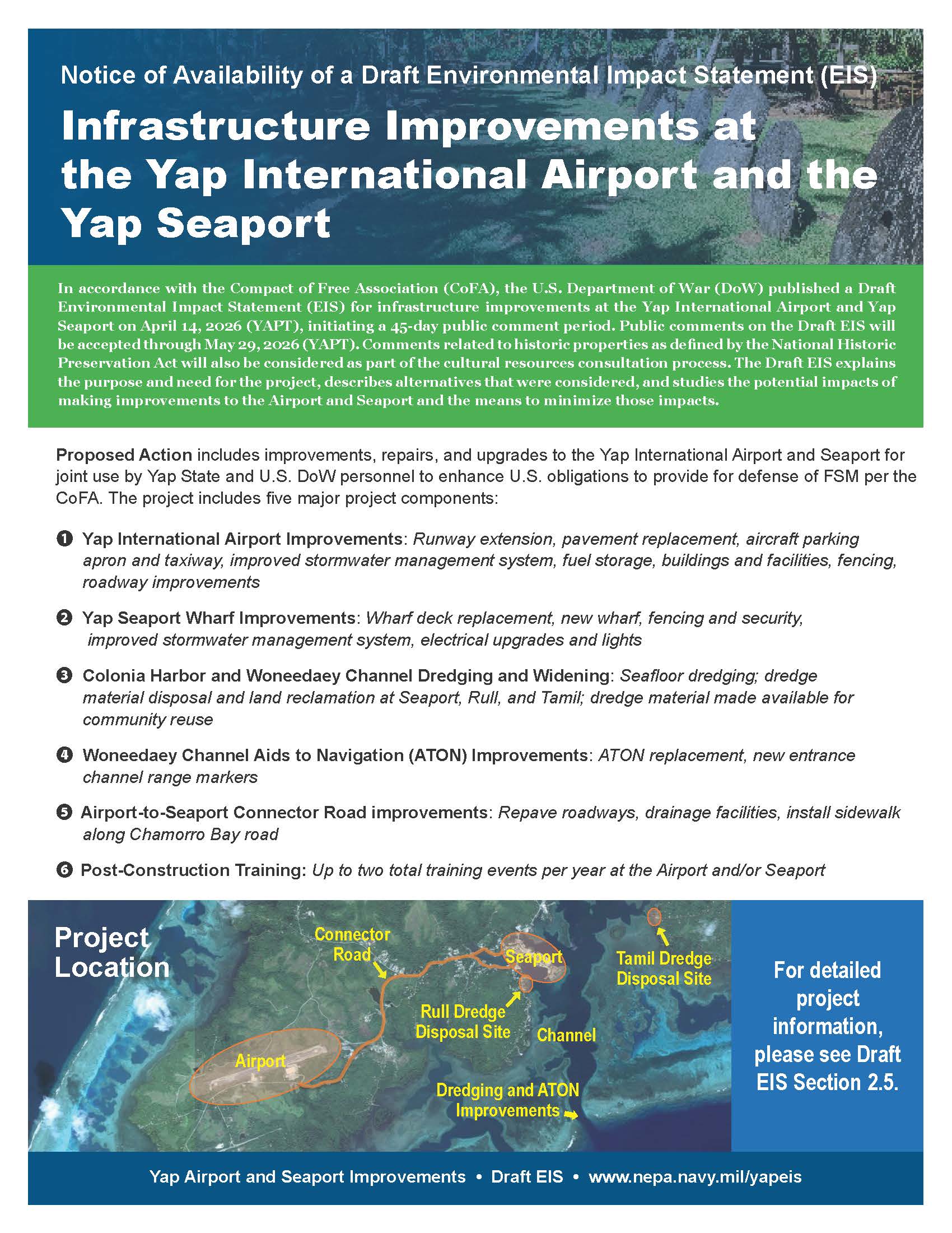 This website is an online resource for information on the preparation of the EIS to evaluate the potential environmental impacts of the Proposed Action to perform various improvements, repairs, and upgrades to the Yap Airport and Seaport. The United States (U.S.) Department of War (DoW) proposes to construct improvements and conduct military training at Yap International Airport (Airport) and Yap Seaport (Seaport), located in Yap State, Federated States of Micronesia (FSM). The Compact of Free Association (CoFA) governs the relationship between FSM and the U.S. and commits the U.S. to provide for the defense of the FSM. The proposed Airport and Seaport improvements would support the U.S. in fulfilling its defense responsibilities under the CoFA and provide a substantial investment in aging infrastructure for long-term use by Yap State. The improvements would also support U.S.-led multi-national military training including contingency response and humanitarian assistance training in the region.